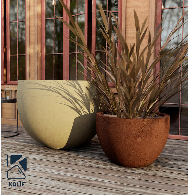 De plantenbakken en bloempotten van Kalif Design noemen wij met recht "Natuurlijke Kunstwerken"! Bij natuurlijke kunstwerken horen kleine oneffenheden en kleurnuances. Dit is kenmerkend voor het materiaal en de productiemethode van Kalif Design Plantenbakken. Wanneer de plantenbakken in contact komen met de buitenlucht zullen ze in de eerste weken wat veranderen van kleur. Het kalk in de plantenbakken en het vocht in het beton moeten een nieuw evenwicht vinden. Na een tijdje ontstaat er een prachtige gemêleerde kleur! Let op; door het afgeven van kalk kunnen er wat kalkvlekken ontstaan onder je plantenbak.